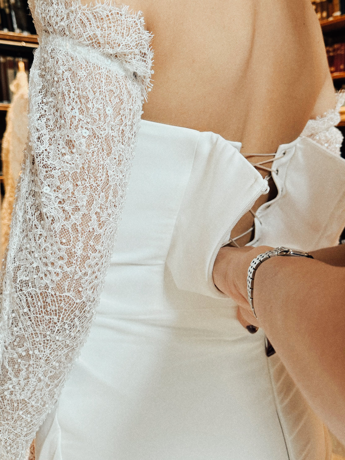إذا كنتِ على مسافة بعيدة، فلا تقلقي: يمكنك إرسال قياساتك إلينا باستخدام دليلنا المفصّلسنقدم لكِ مشورة شخصية طوال العملية لضمان ملاءمة فستانك بشكل مثالي.