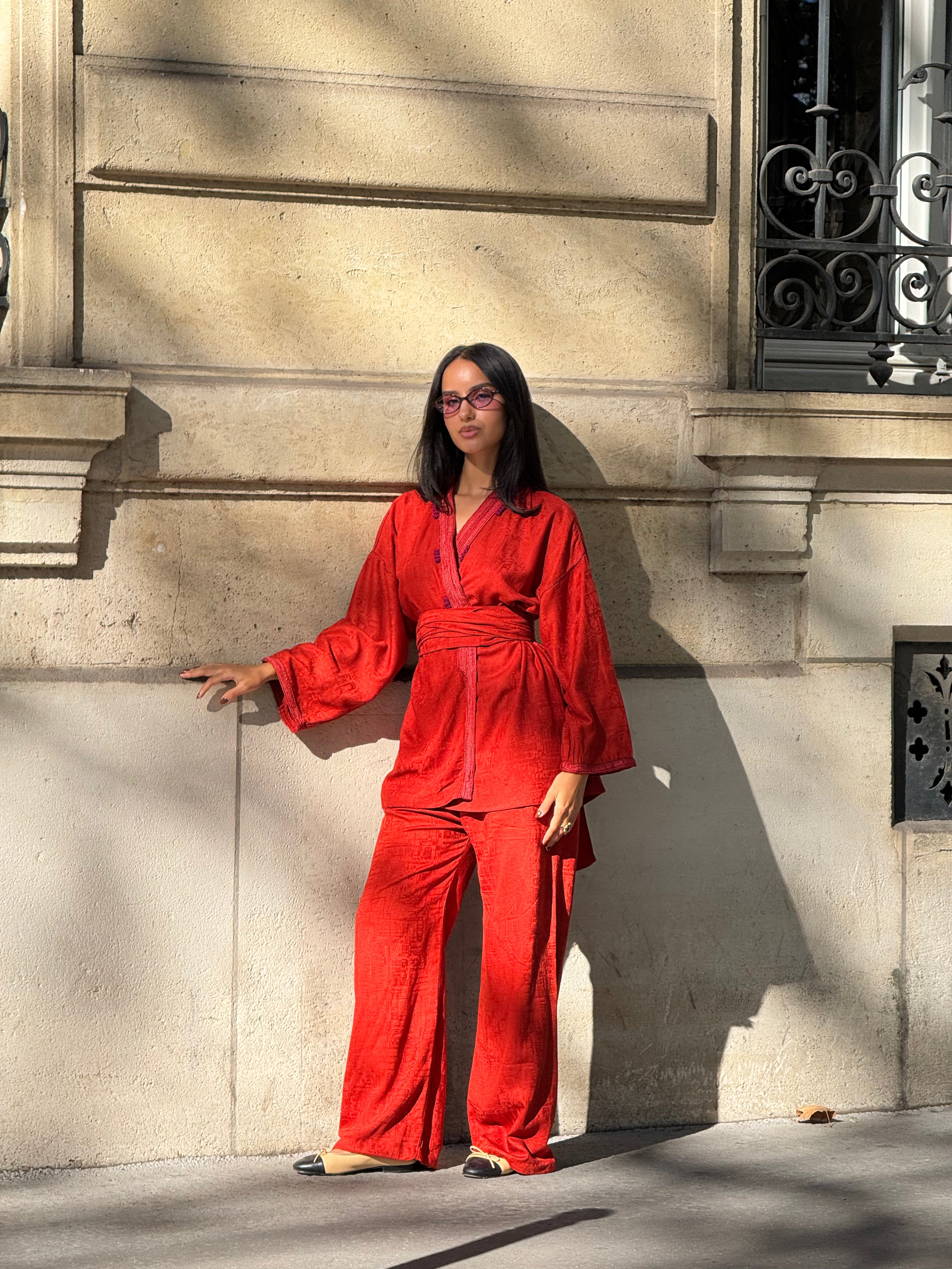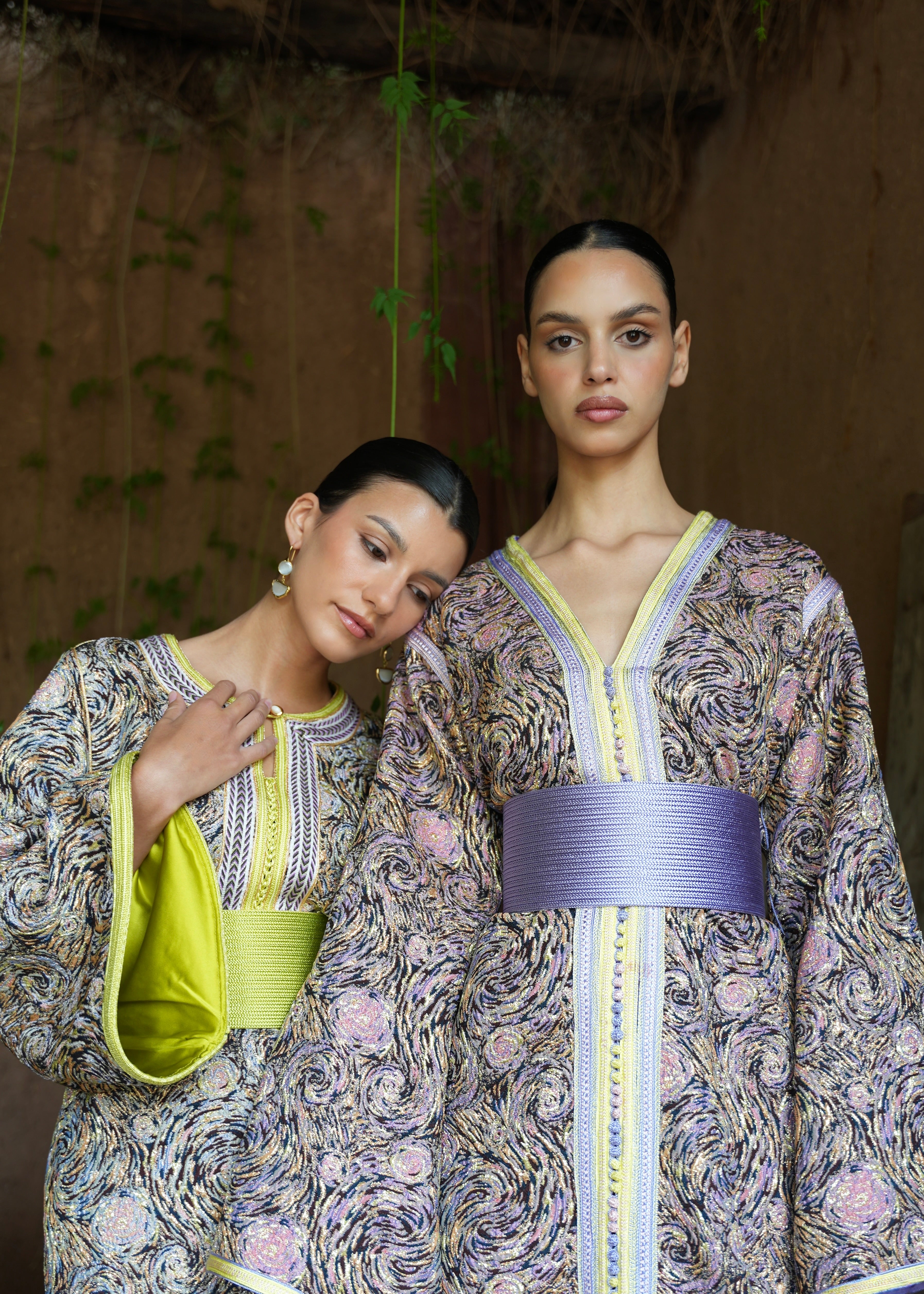 تضفي اللمسات النهائية الرقيقة والحزام المطرز يدويًا لمسة من الرقي دون أن تثقل كاهل التصميم. يعكس كل تفصيل من تفاصيل هذا الموديل دقة الحرفية المغربية، ويجمع بين الأصالة والحداثة فيتوازن مثالي.