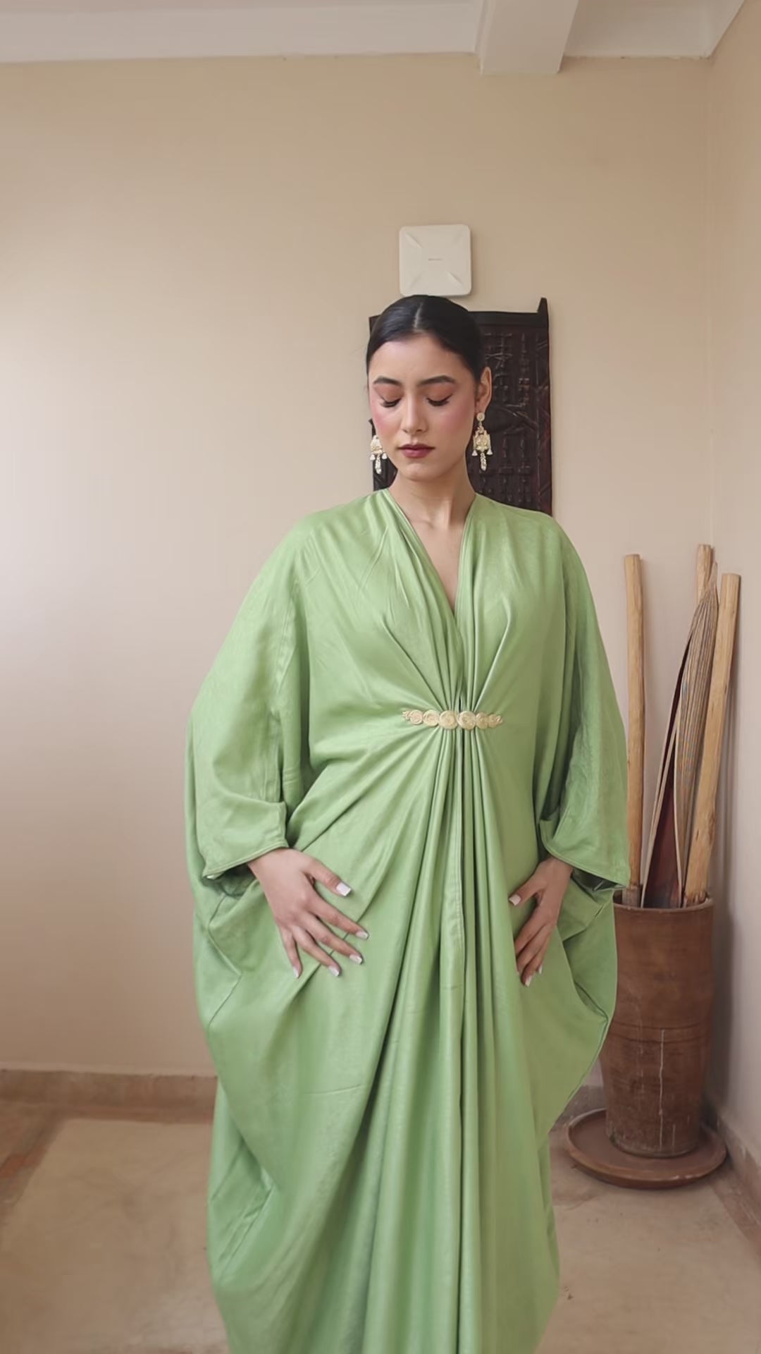 Sublimez votre féminité avec cette robe en soie mlifa verte à col V drapé, une pièce d’exception inspirée de la mode orientale contemporaine.